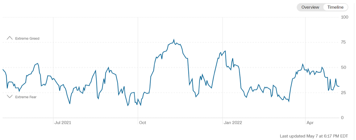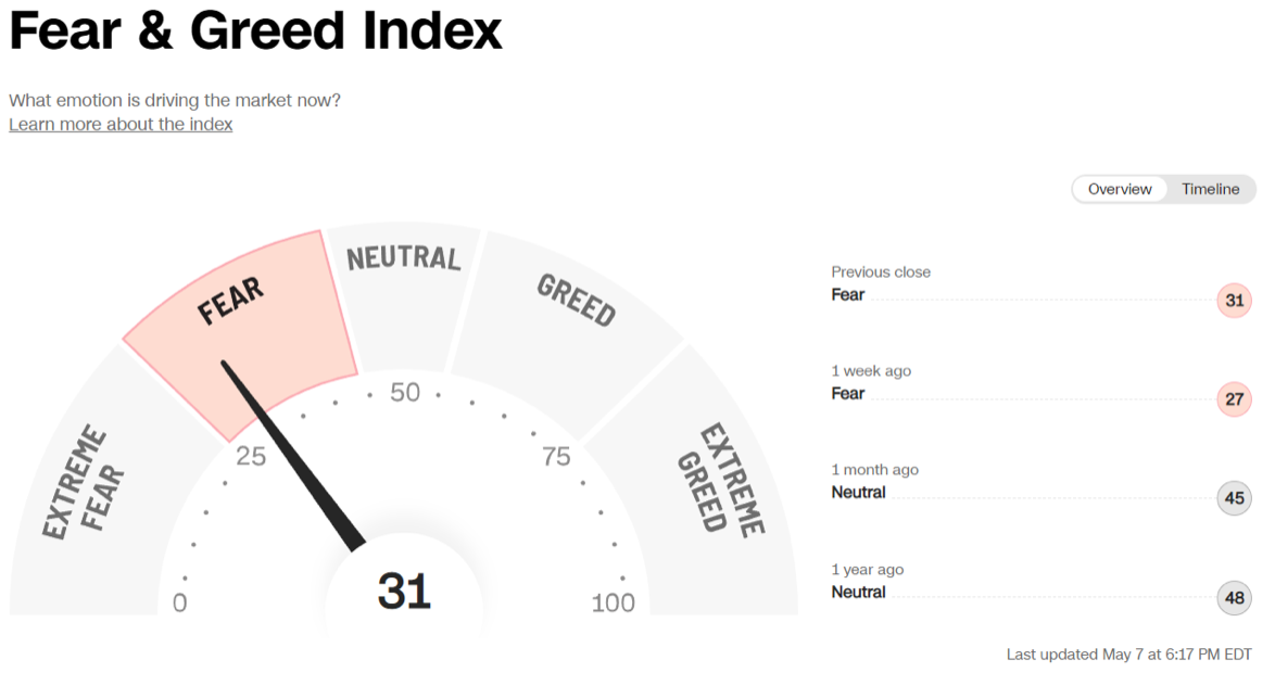 Il Fear&Greed Index sale a quota 31, indicando la paura come sentiment prevalente. Una settimana fa il valore era pari a 27.