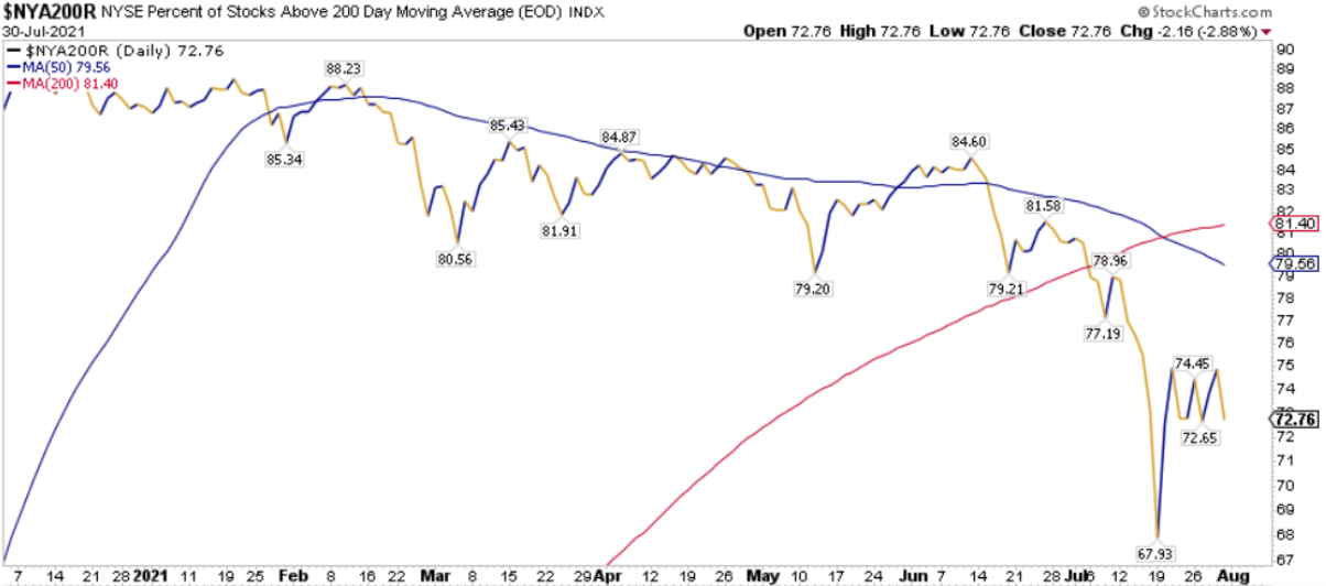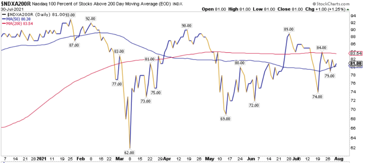 La percentuale dei titoli S&P500 scambiati sopra la loro media mobile a 200 periodi è pari all’ 87.98%, sul Nasdaq100 l’81.00% dei titoli prezza sopra lo stesso indicatore, mentre sul NYSE la percentuale è pari al 72.76%.