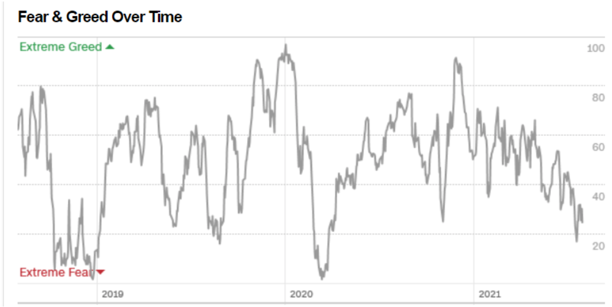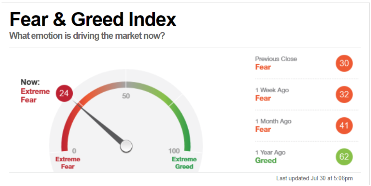 Il Fear&Greed Index scende a quota 24, indicando la paura come sentiment prevalente. Una settimana fa il valore era pari a 32.