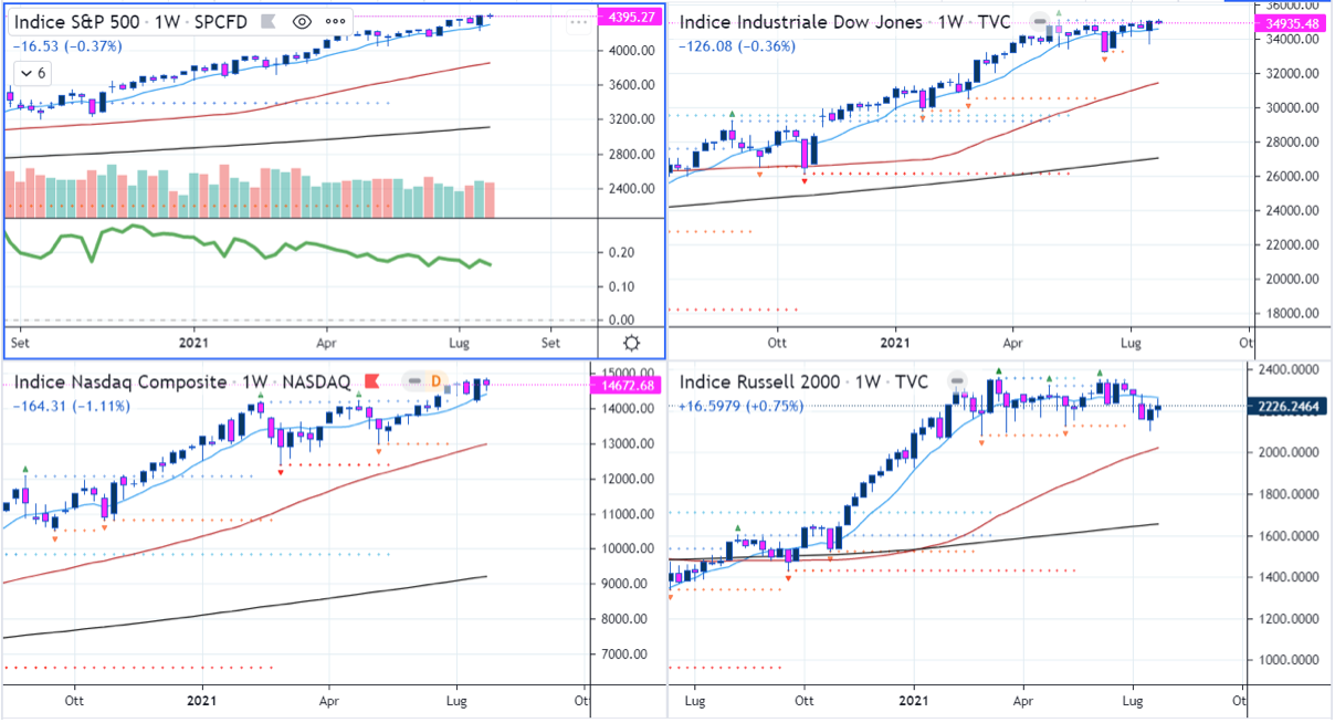 Nonostante le percentuali in negativo, gli indici non hanno poi fatto così male e si sono potuti riavvicinare alle medie. Il Nasdaq ha trovato supporto appena sopra la EMA21D e dista appena il 2.9% dalla SMA50D. Il Nasdaq 100 ha ridotto la distanza al 4.4% rispetto al 6.7% della settimana precedente.