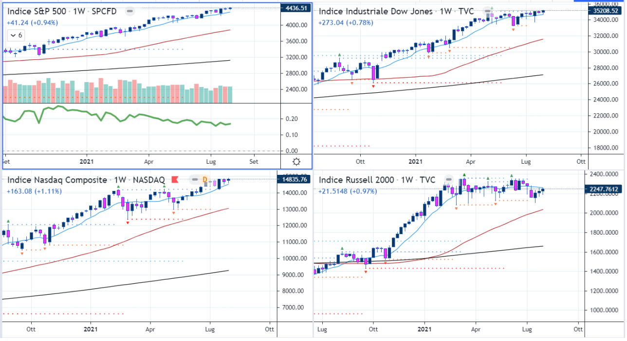 La EMA21D ha dimostrato ancora una volta di essere un livello molto importante, non solo come area di supporto, ma anche per la ripartenza degli indici verso nuovi massimi. I titoli growth in generale non hanno avuto una settimana negativa, ma il report sul mercato del lavoro per il mese di Luglio ha provocato un rialzo dei rendimenti del T-10yrs e rassicurato gli investitori sulla ripresa economica, favorendo i finanziari e le industrie più collegate all’economia tradizionale e alla ripresa, a discapito del tech (in particolare l’industria software).