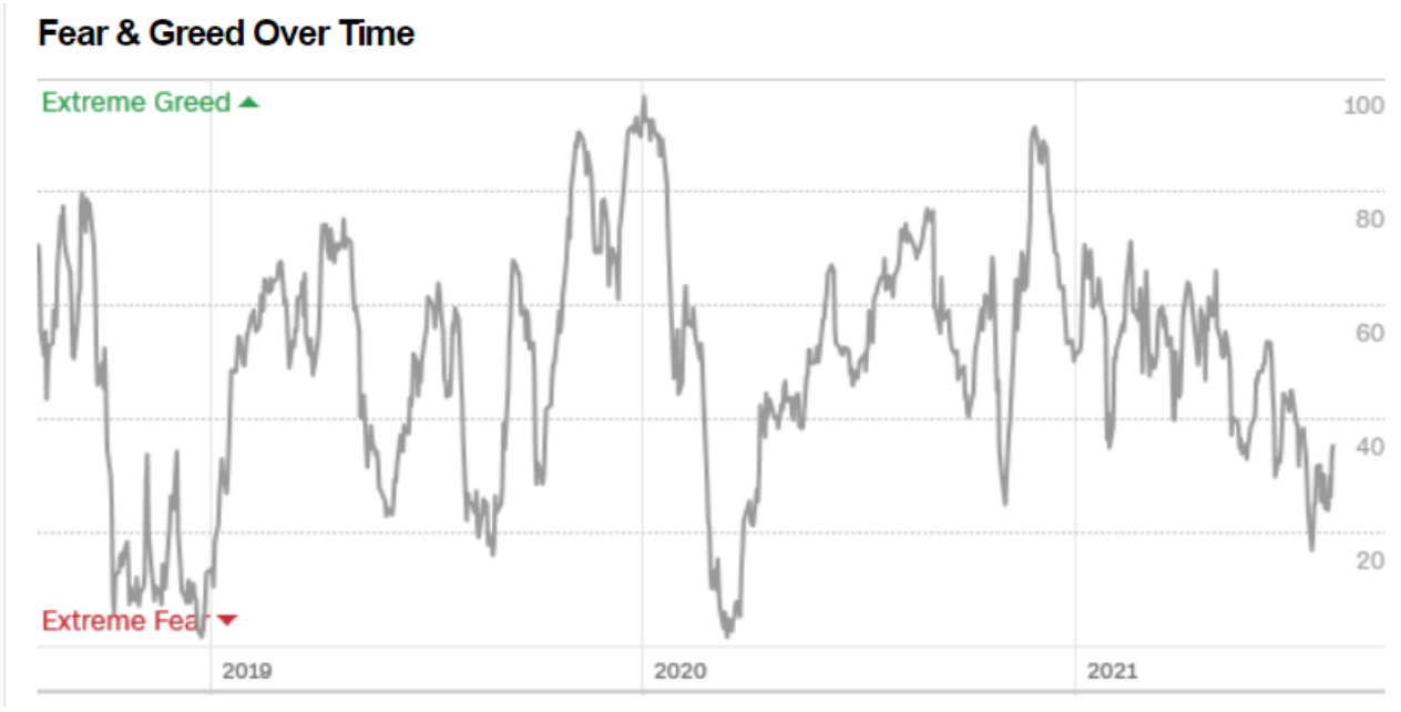Il Fear&Greed Index sale a quota 36, indicando la paura come sentiment prevalente. Una settimana fa il valore era pari a 24.
