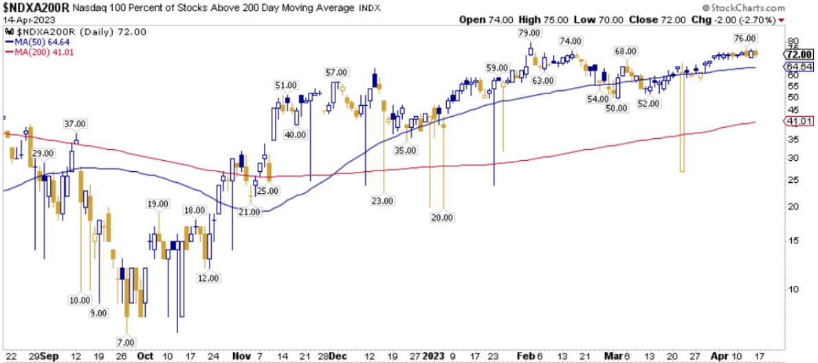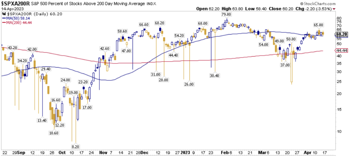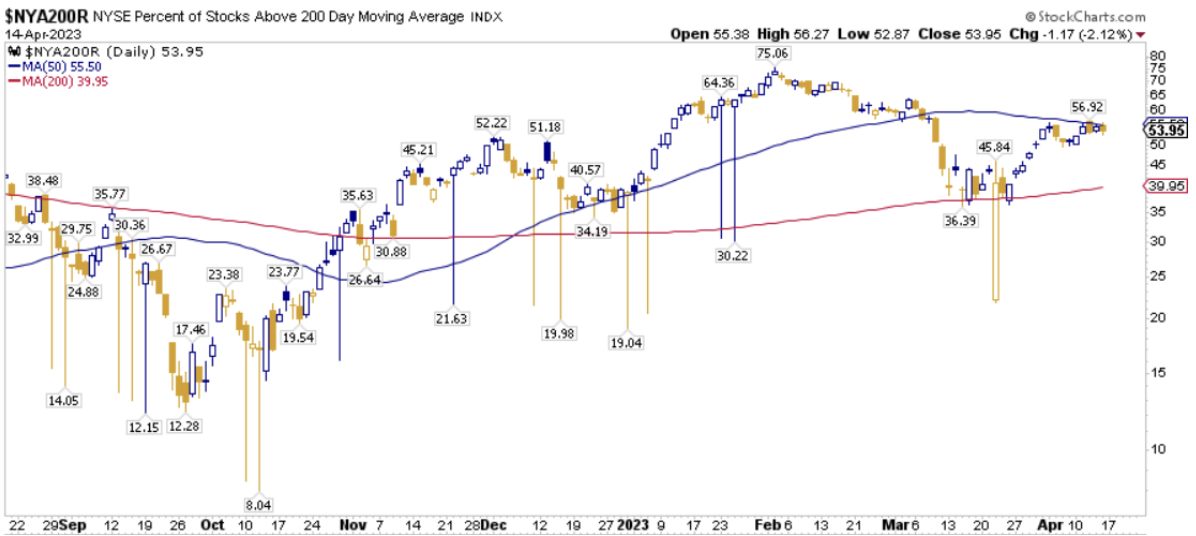La percentuale dei titoli S&P500 scambiati sopra la loro media mobile a 200 periodi è pari al 60.20%, sul Nasdaq100 il 72.00% dei titoli prezza sopra lo stesso indicatore, mentre sul NYSE la percentuale è pari al 53.95%.