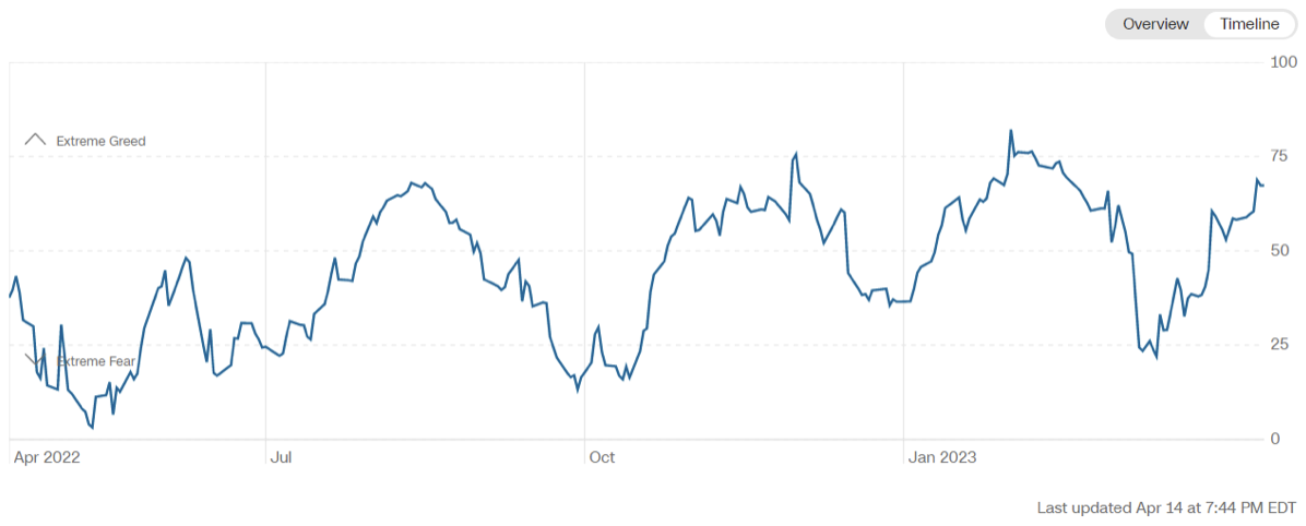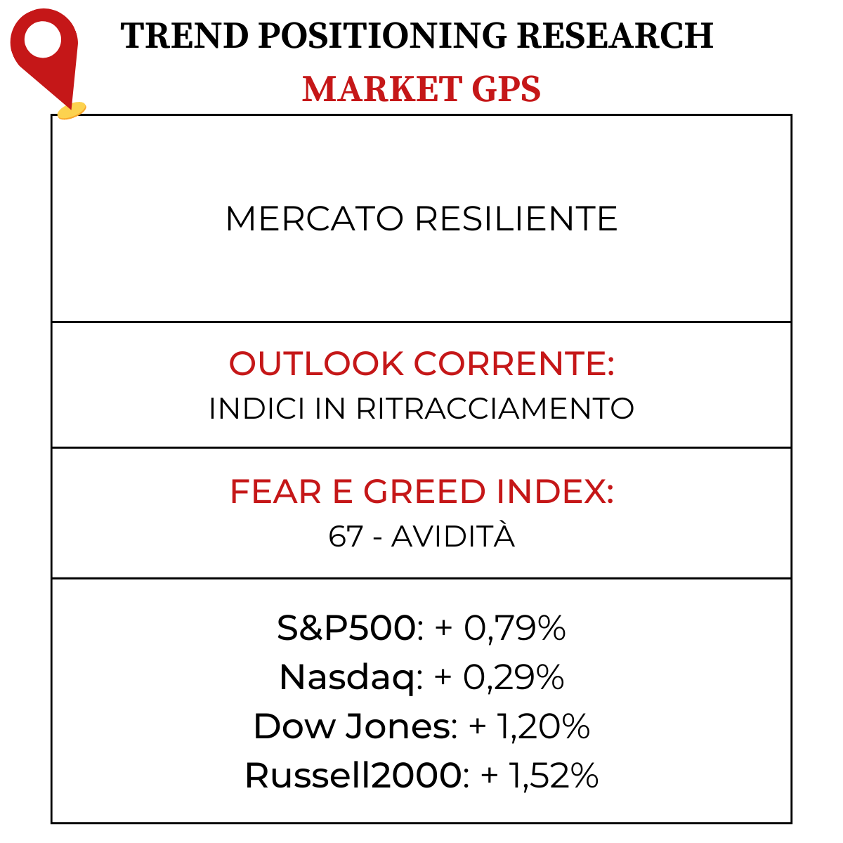 Il Fear&Greed Index sale a quota 67, indicando l’avidità come sentiment prevalente. Una settimana fa il valore era pari a 57.