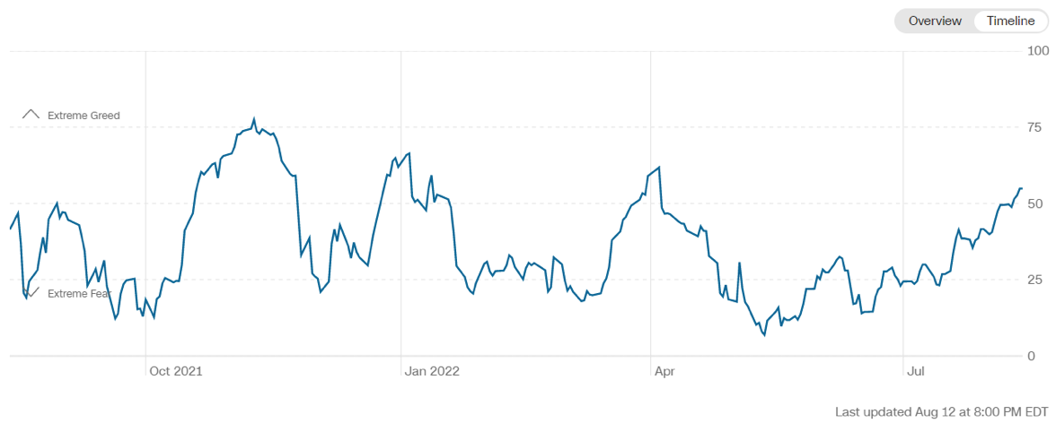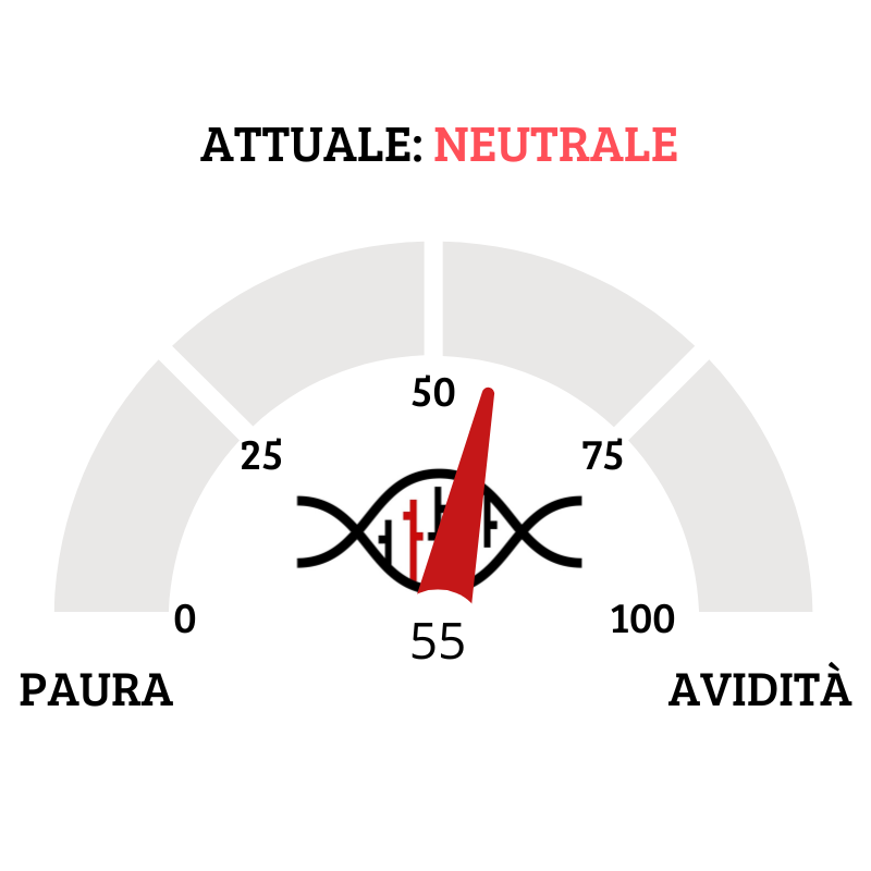 Il Fear&Greed Index sale a quota 55, indicando equilibrio tra paura ed avidità. Una settimana fa il valore era pari a 49.