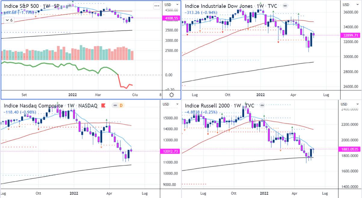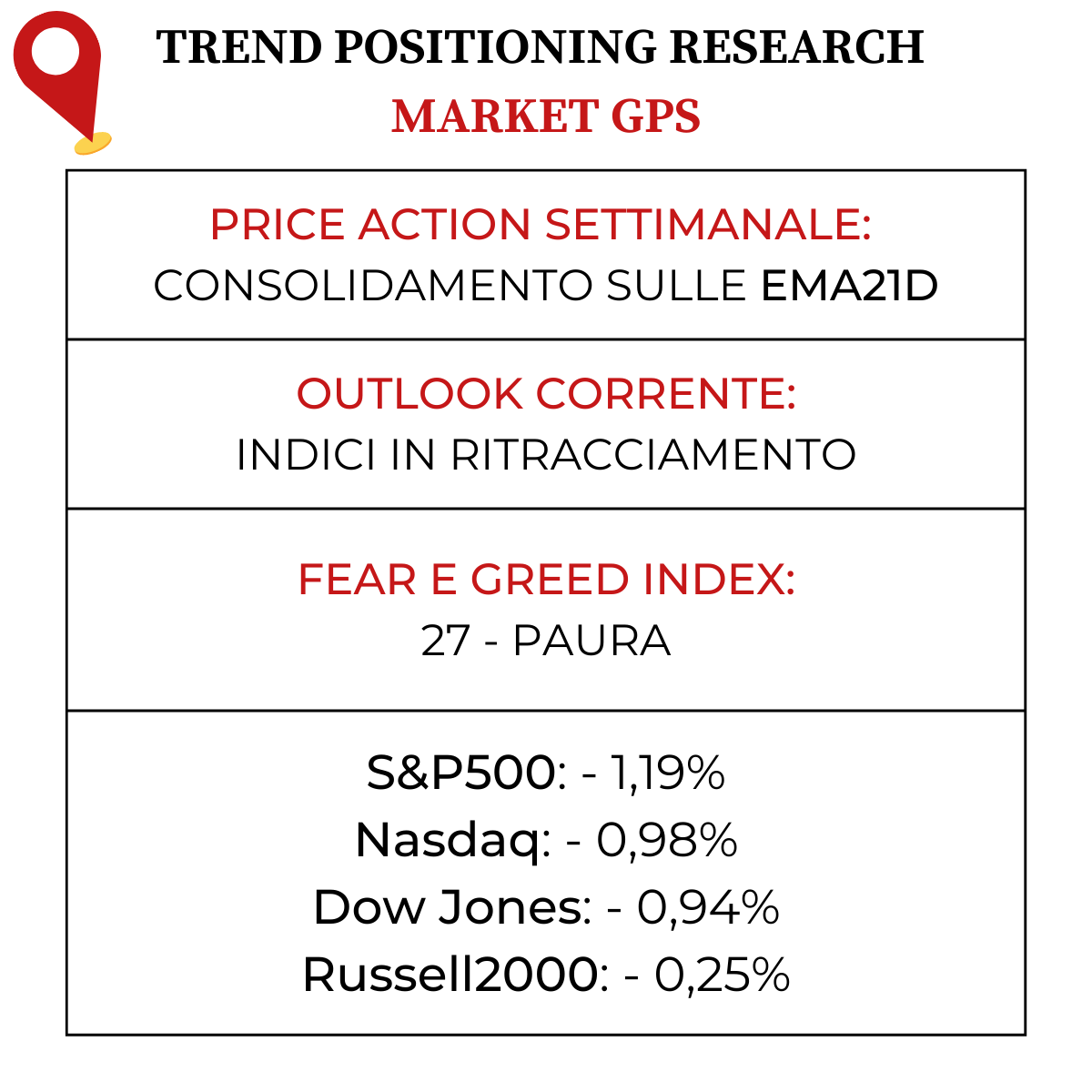 Nonostante le chiusure settimanali negative, apprezzabile vedere gli indici rimanere sopra le rispettive EMA21D senza collassare come successo nelle scorse settimane al primo tentativo di rally, dando forma ad una sorta di fase laterale. Questo ha permesso di limitare i danni anche dopo il sell-off di Venerdì.