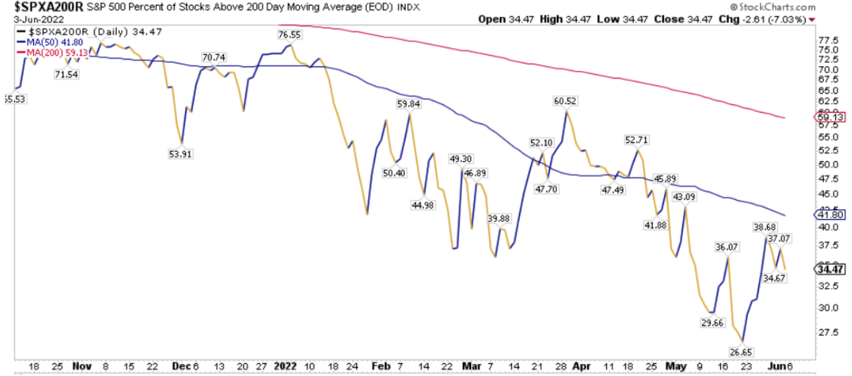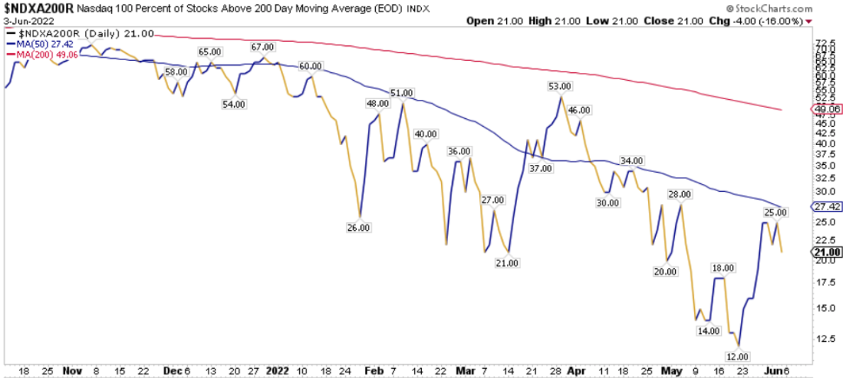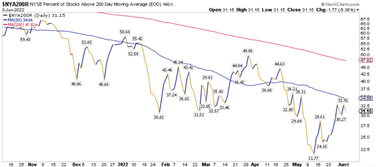 La percentuale dei titoli S&P500 scambiati sopra la loro media mobile a 200 periodi è pari al 34.47%, sul Nasdaq100 il 21.00% dei titoli prezza sopra lo stesso indicatore, mentre sul NYSE la percentuale è pari al 31.15%.