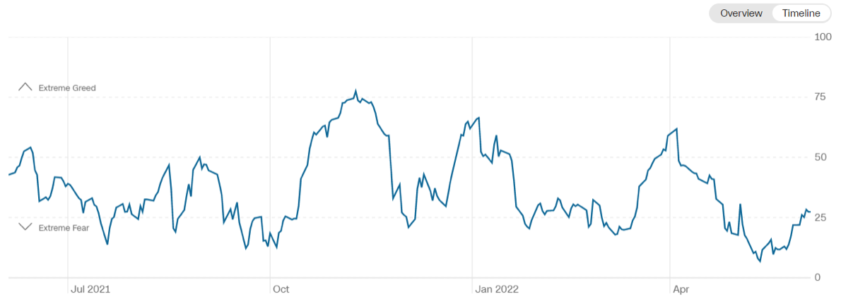 Il Fear&Greed Index sale a quota 27, indicando la paura come sentiment prevalente. Una settimana fa il valore era pari a 21.