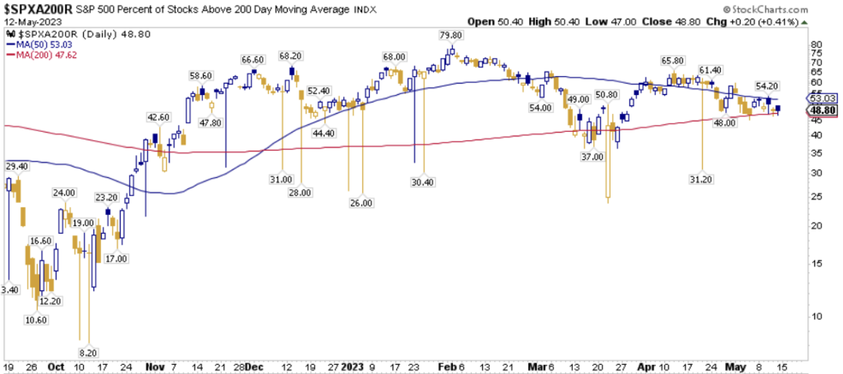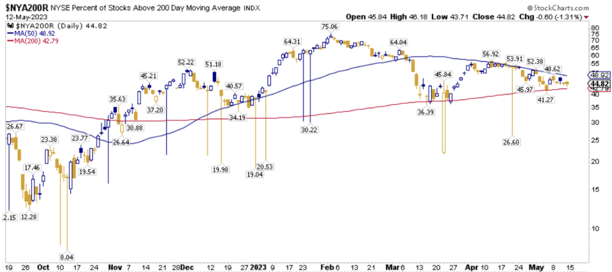 La percentuale dei titoli S&P500 scambiati sopra la loro media mobile a 200 periodi è pari al 48.80%, sul Nasdaq100 il 66.00% dei titoli prezza sopra lo stesso indicatore, mentre sul NYSE la percentuale è pari al 44.82%.