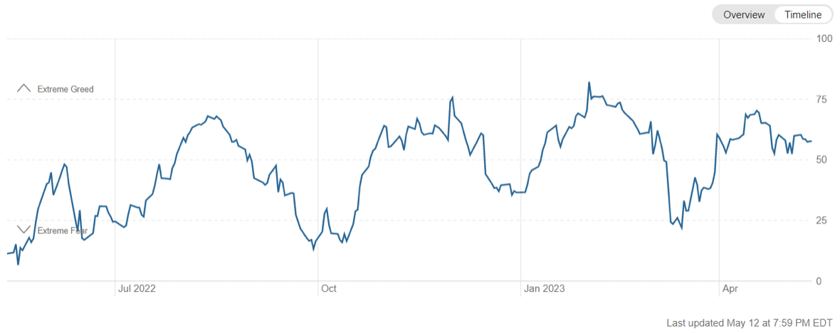 Il Fear&Greed Index scende a quota 58, indicando l’avidità come sentiment prevalente. Una settimana fa il valore era pari a 59.