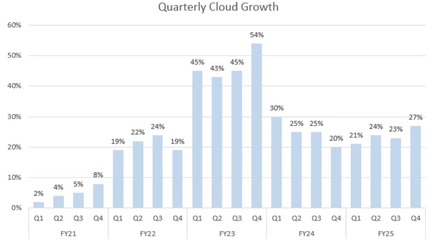 L’RPO cloud ammonta a circa 110 miliardi di dollari, con un incremento del 56% su base annua nell’anno fiscale 2025, dopo una crescita dell’80% nell’anno fiscale 2024.