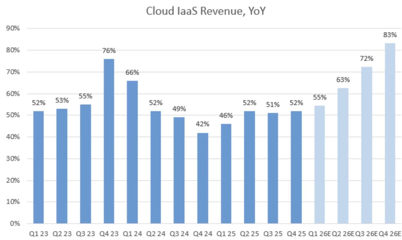 Gli analisti di Jefferies hanno evidenziato che le stime attuali del mercato prevedono per il 2028 ricavi da infrastrutture cloud (IaaS) pari a 46 miliardi di dollari, su un totale di 93 miliardi di dollari di fatturato complessivo.