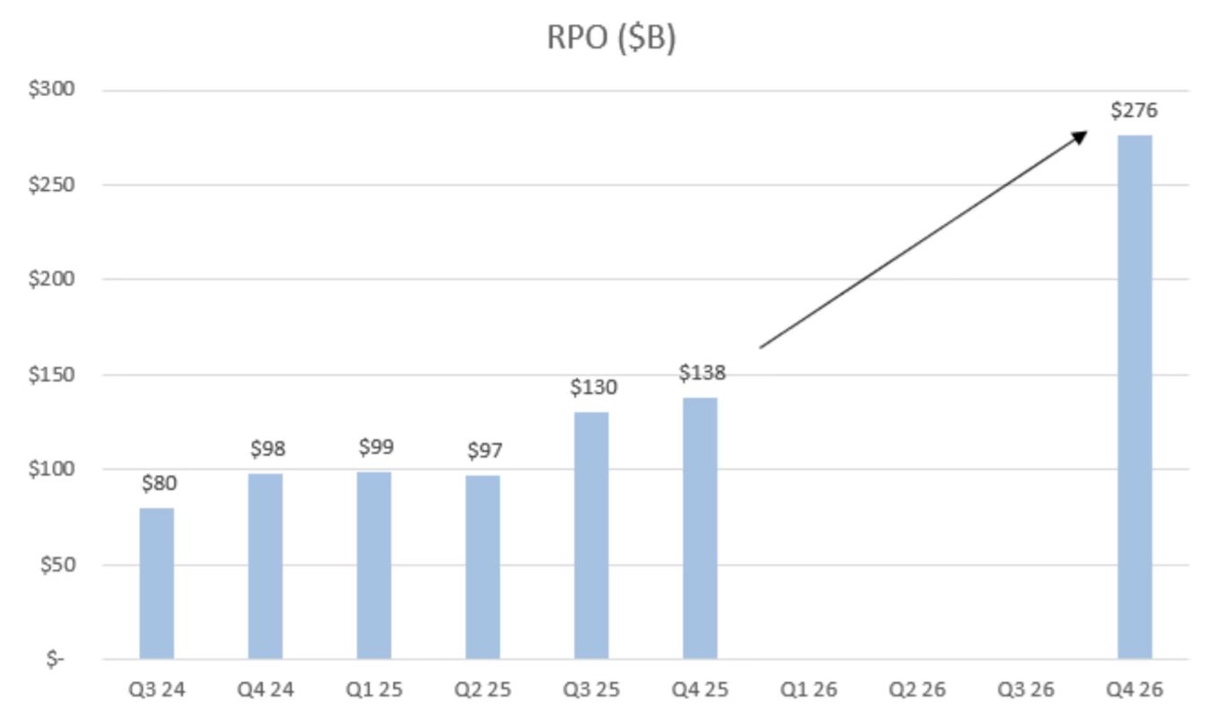 Pertanto, la previsione della dirigenza indica un RPO compreso tra circa 275 e 280 miliardi di dollari, un aumento significativo rispetto ai 40 miliardi di crescita annua registrati nell’anno fiscale 2025.
