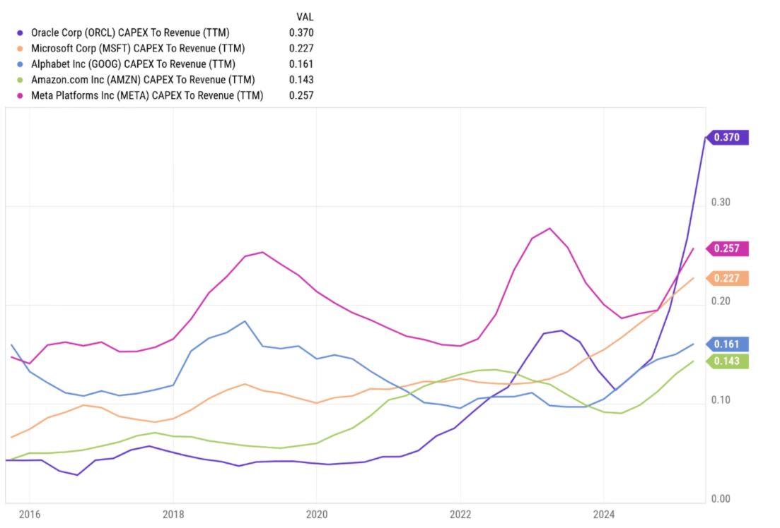 Sebbene i 25 miliardi di dollari di Oracle possano sembrare modesti rispetto ai 105 miliardi previsti da Amazon per il capex nello stesso anno, la spesa di Oracle è rilevante in rapporto alla sua dimensione aziendale.