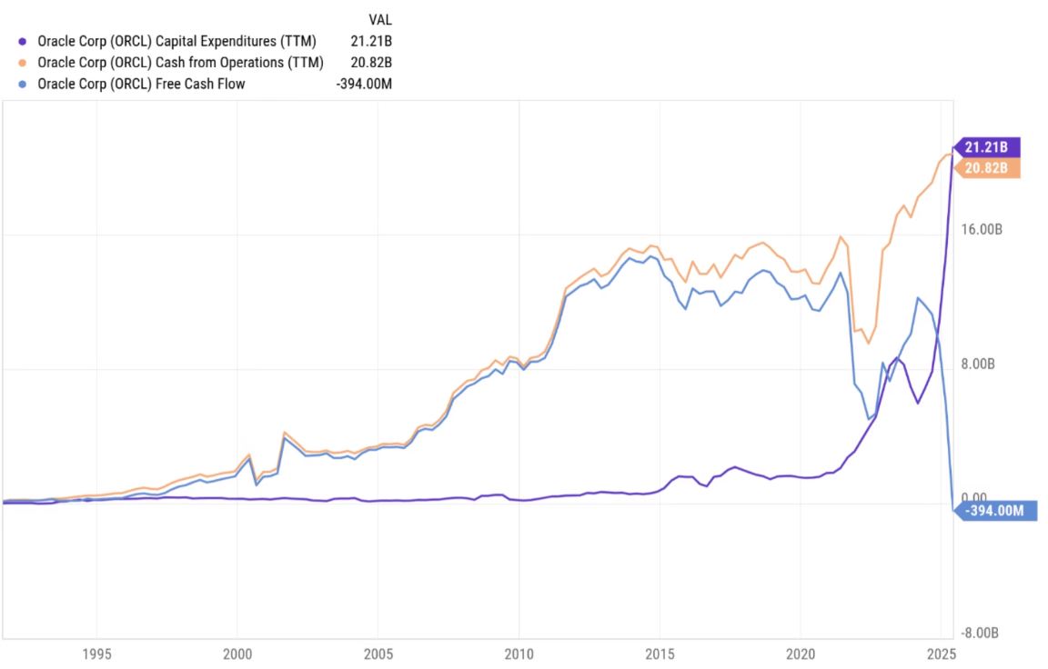 Per la prima volta, Oracle ha speso in capex più di quanto generato dalle operazioni, portando il FCF in territorio negativo per l’intero anno, con un saldo di -394 milioni di dollari.