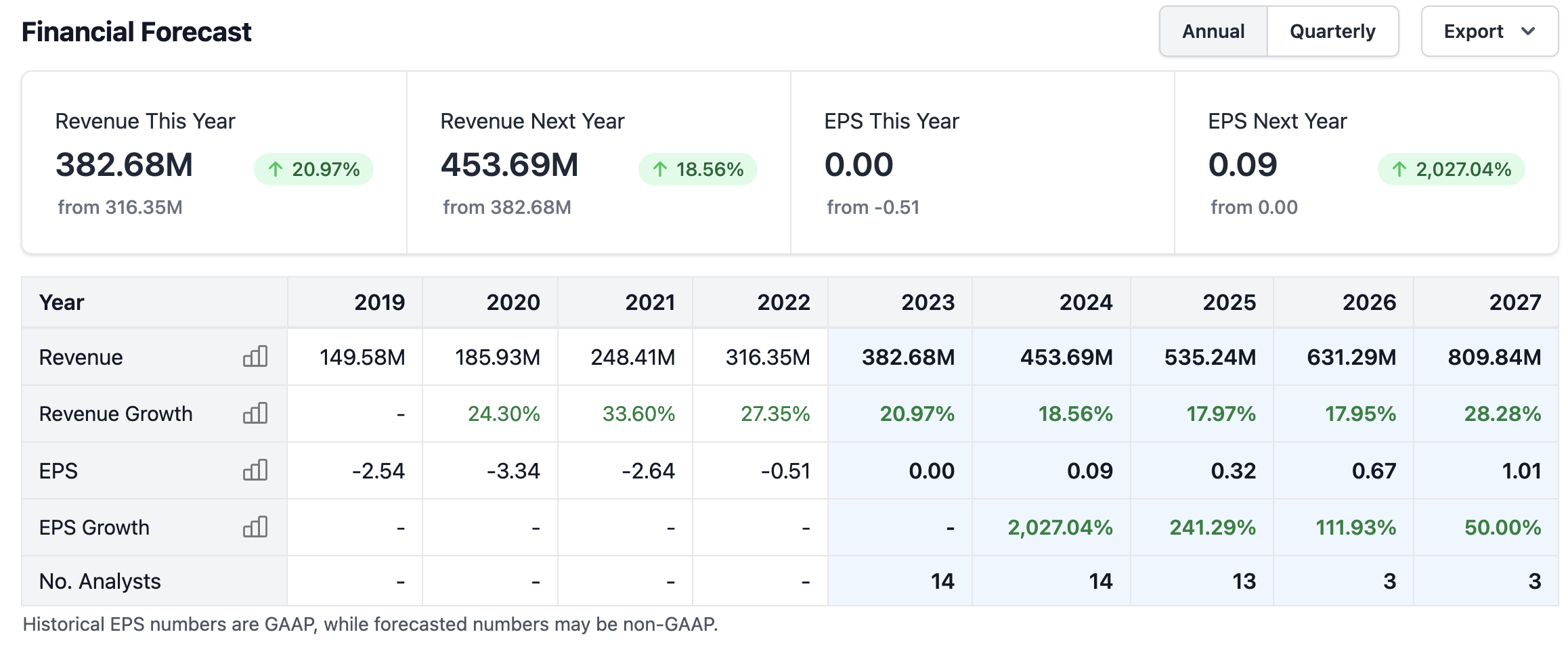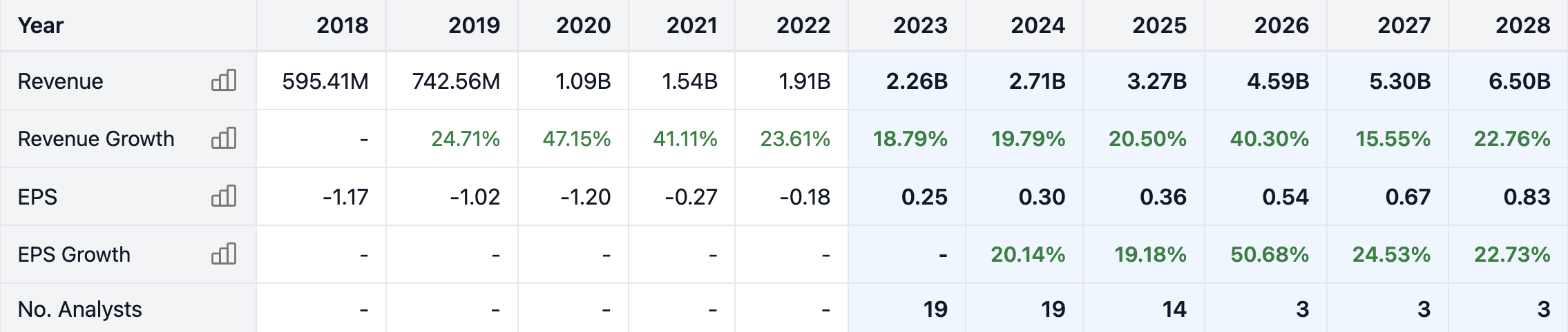 La crescita dei ricavi dovrebbe toccare il fondo nel quarto trimestre per poi accelerare in ogni trimestre del prossimo anno. La guidance del quarto trimestre implica un rallentamento quindi la sfida sarà quella di tornare rapidamente a una crescita dei ricavi superiore al 18% prevista per il 2024 rispetto al 21% del 2020.