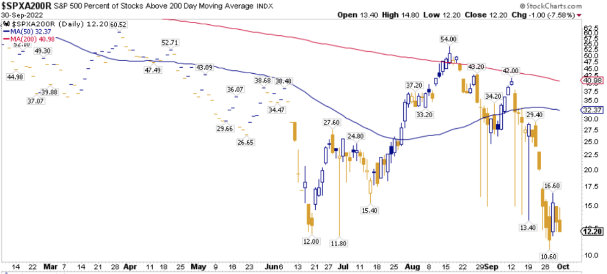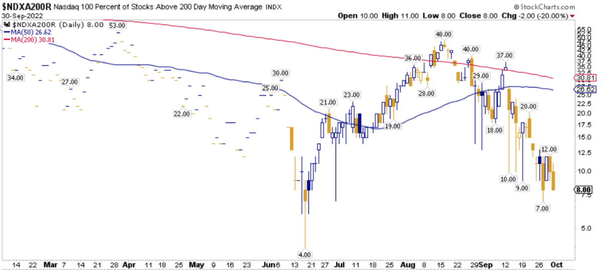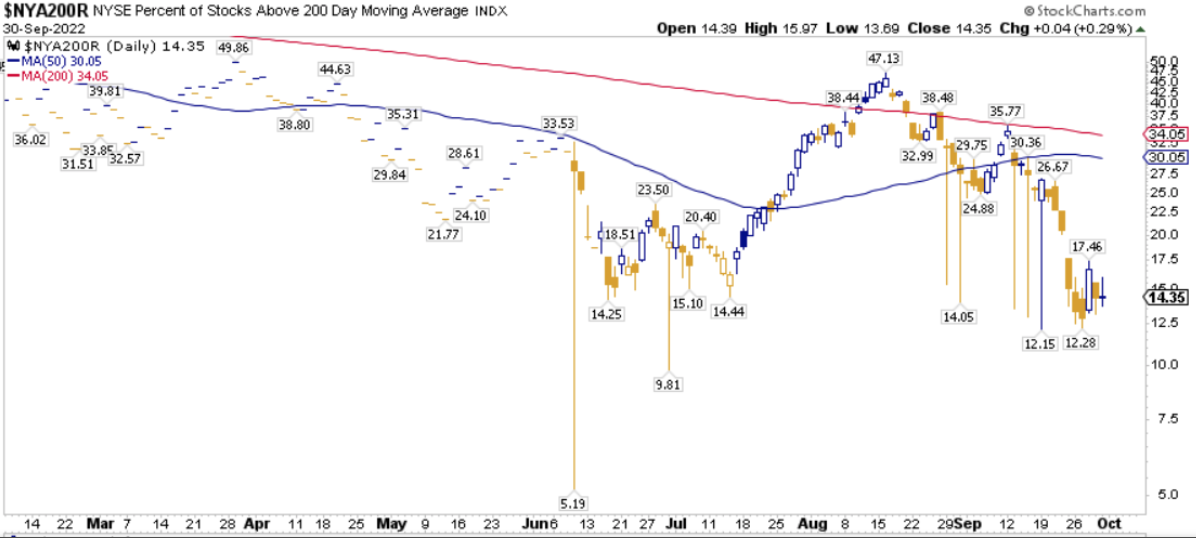 La percentuale dei titoli S&P500 scambiati sopra la loro media mobile a 200 periodi è pari al 12.20%, sul Nasdaq100 l’8.00% dei titoli prezza sopra lo stesso indicatore, mentre sul NYSE la percentuale è pari al 14.35%.