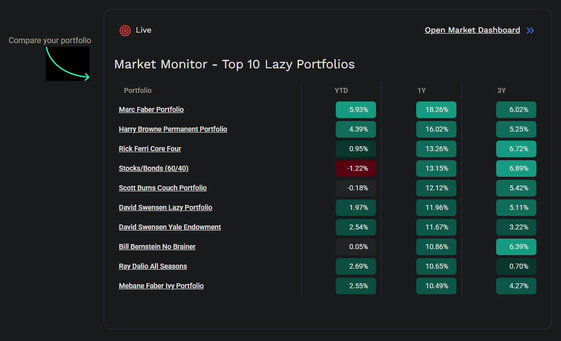 Guarda il confronto tra YTD e 3 anni: nel 2025, un anno duro per i mercati, il YTD mostra risultati modesti, con il Marc Faber Portfolio al +5,93% come migliore e il Stocks/Bonds 60/40 al -1,22% (Aaaaah, la diversificazione).