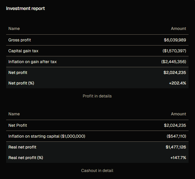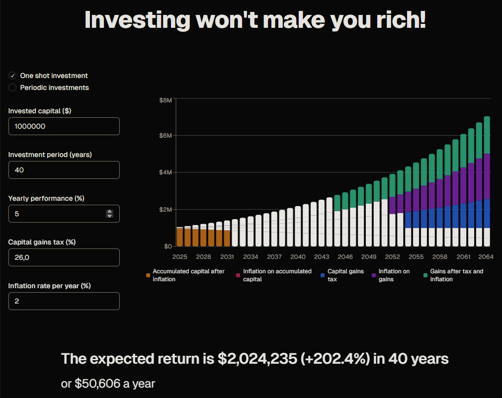 Come il grafico precedente, mostra che un investimento di $1M con un rendimento del 5% annuo per 40 anni genera un profitto netto di $2,024,235 (+202.4%), ma solo $1,477,126 (+147.7%) in termini reali, dopo tasse e inflazione.