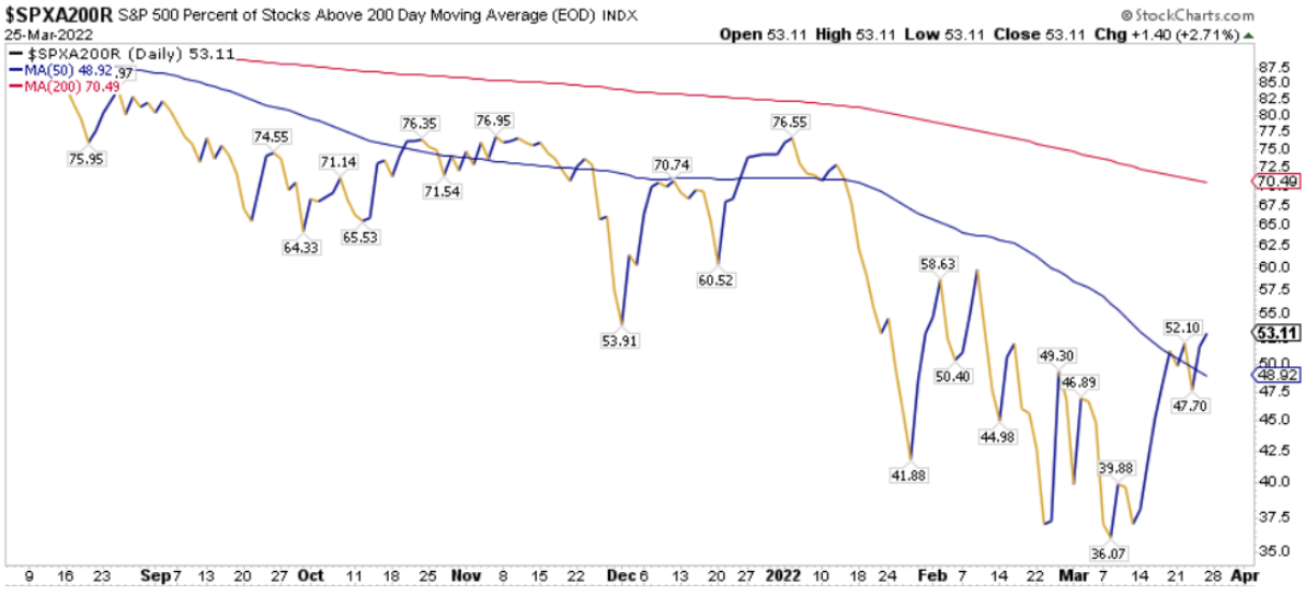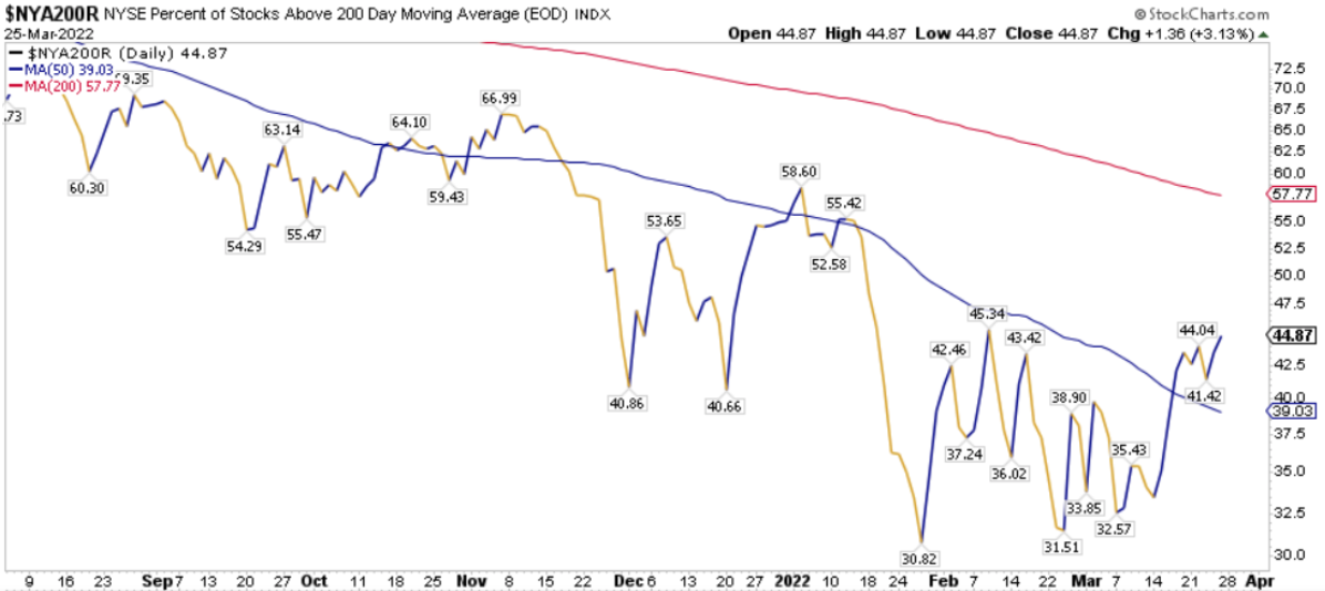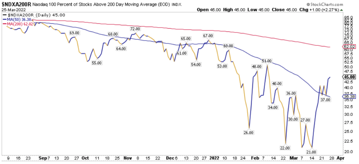 La percentuale dei titoli S&P500 scambiati sopra la loro media mobile a 200 periodi è pari al 53.11%, sul Nasdaq100 il 45.00% dei titoli prezza sopra lo stesso indicatore, mentre sul NYSE la percentuale è pari al 44.87%.