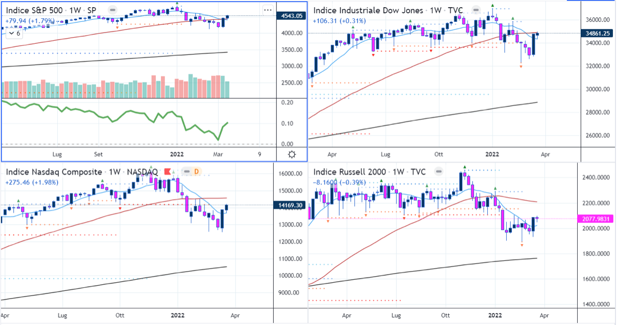Buona settimana da parte del Nasdaq e dell’S&P500 che si porta nuovamente sopra la SMA200D. Livello chiave vicino anche per il Dow. Notevole la performance del Nasdaq nelle ultime settimane, nonostante il rendimento del T-10yrs in ascesa.