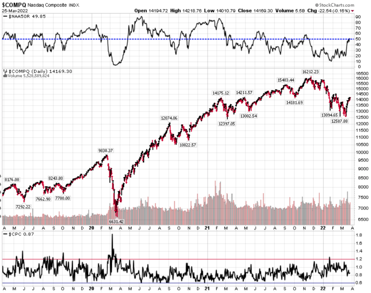 Divergenza $NAAR50 vs $COMP: aumento della percentuale di titoli che prezzano sopra la SMA50  rispetto alla settimana precedente, in convergenza con il rialzo dell’indice.
