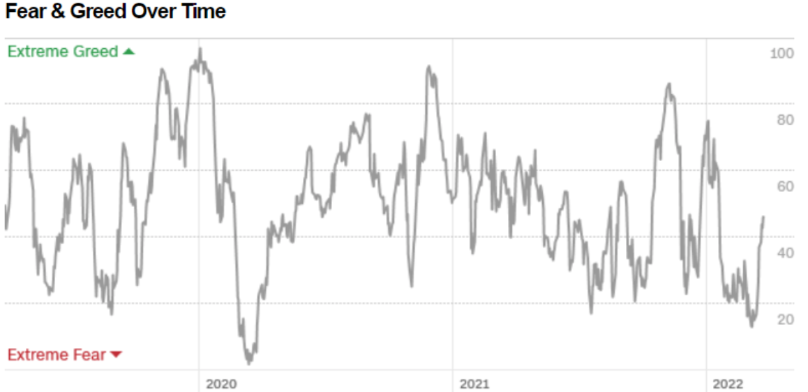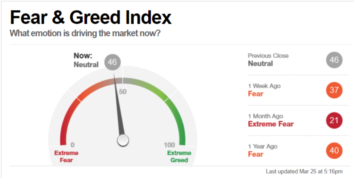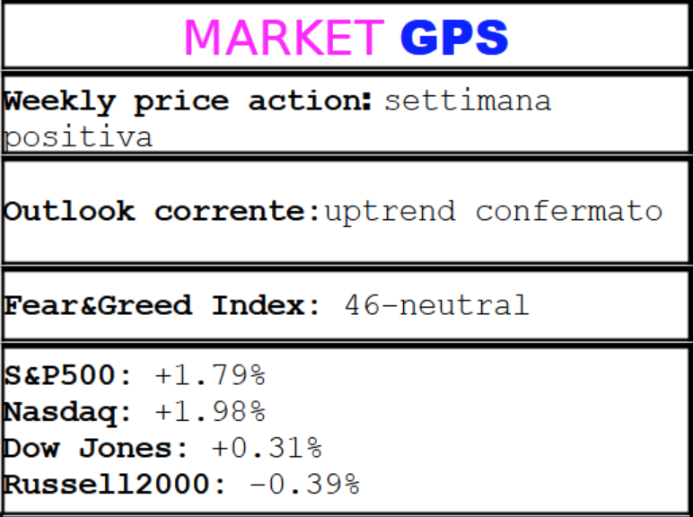 Il Fear&Greed Index sale a quota 46, indicando equilibrio tra paura ed avidità. Una settimana fa il valore era pari a 37.