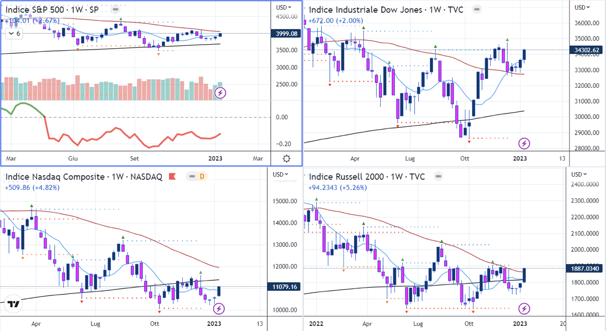 S&P500 di nuovo sopra le SMA50D e SMA200D. Dow Jones e Russell2000 sopra le medie mobili principali e sui massimi relativi di Dicembre.