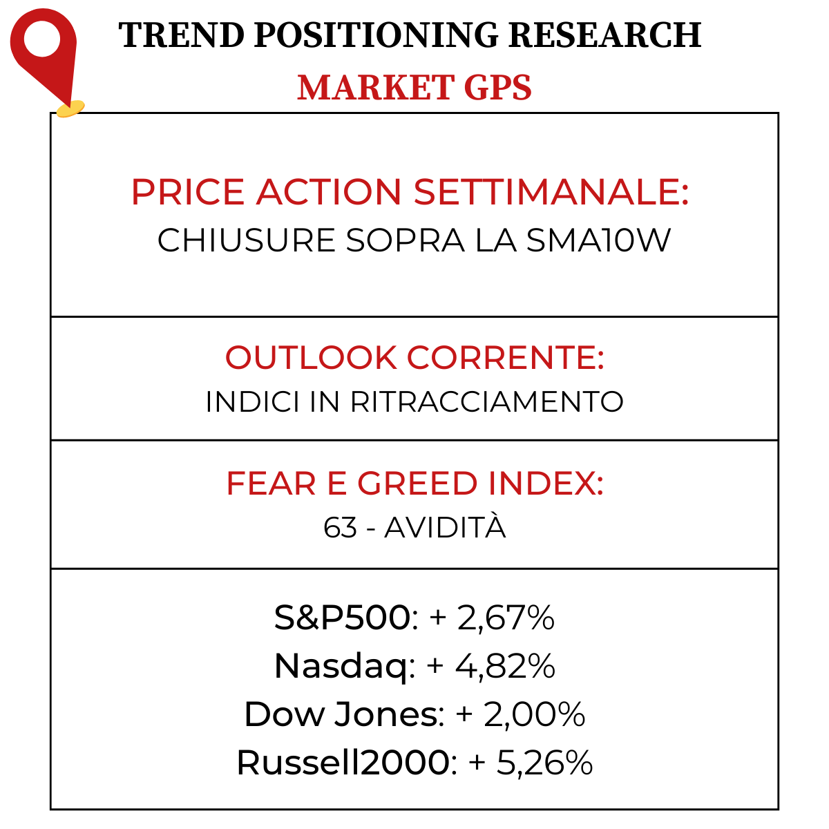Il Fear&Greed Index sale a quota 63, indicando l’avidità come sentiment prevalente. Una settimana fa il valore era pari a 47.