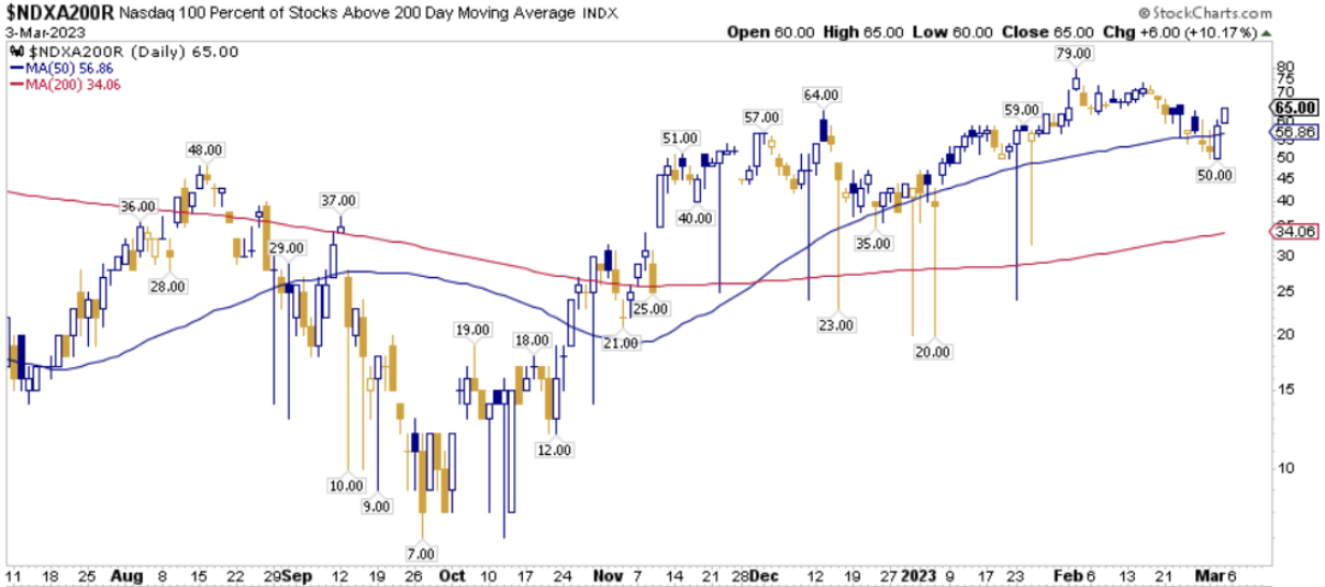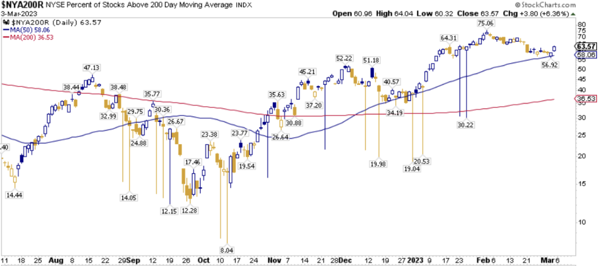 La percentuale dei titoli S&P500 scambiati sopra la loro media mobile a 200 periodi è pari al  65.20%, sul Nasdaq100 il 65.00% dei titoli prezza sopra lo stesso indicatore, mentre sul NYSE la percentuale è pari al 63.57%.