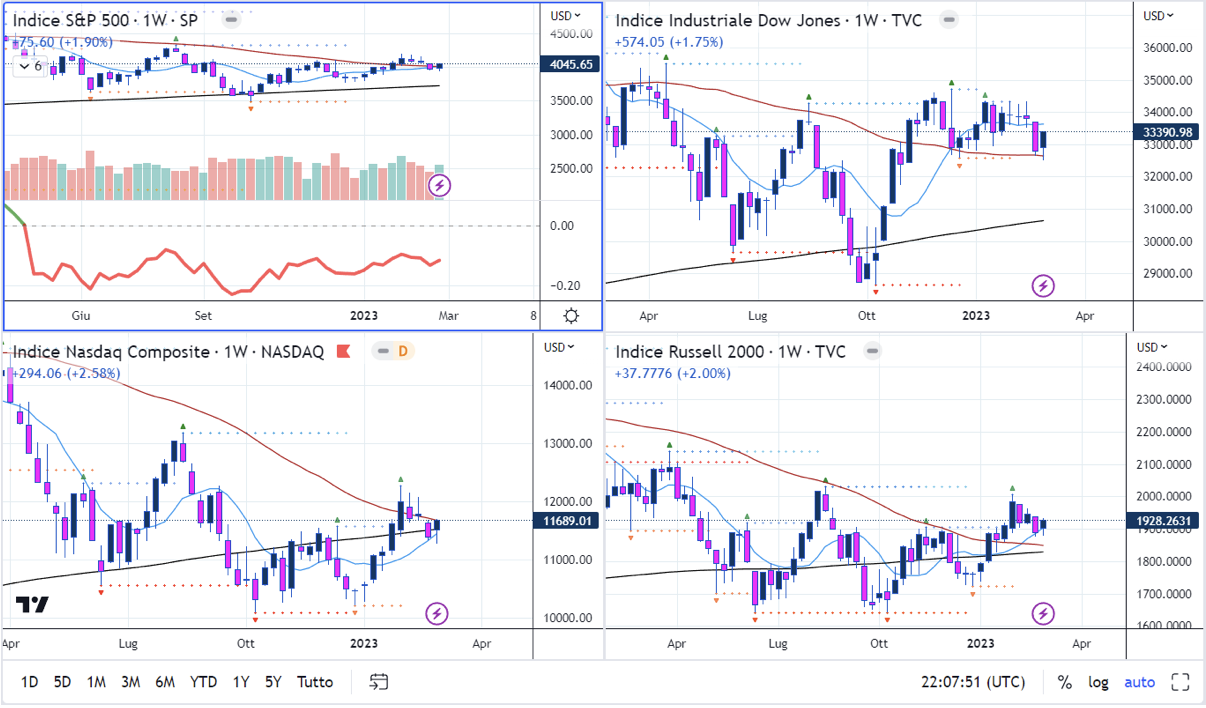 Appena Giovedì mattina ora di NY, l’S&P500 aveva tagliato la sua SMA200D, il Nasdaq era ormai prossimo a testare la SMA50D, mentre il Dow Jones giocava con i minimi del 2023. Insomma, una situazione ben poco bullish.