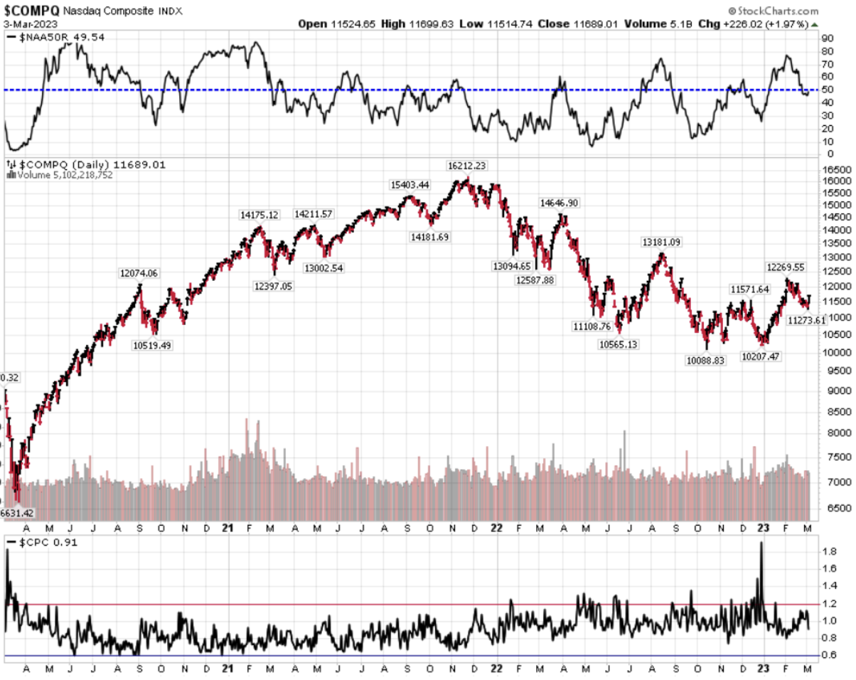 Divergenza $NAAR50 vs $COMP: aumento della percentuale di titoli che prezzano sopra la SMA50  rispetto alla settimana precedente, in convergenza con il rialzo dell’indice.