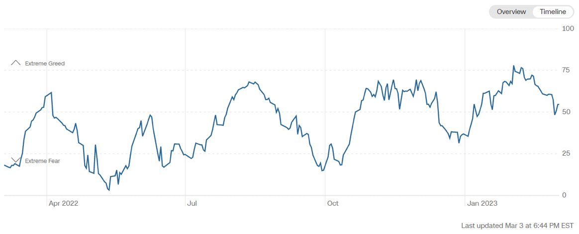 Il Fear&Greed Index scende a quota 55, indicando l’equilibrio tra avidità e paura come sentiment prevalente. Una settimana fa il valore era pari a 60.