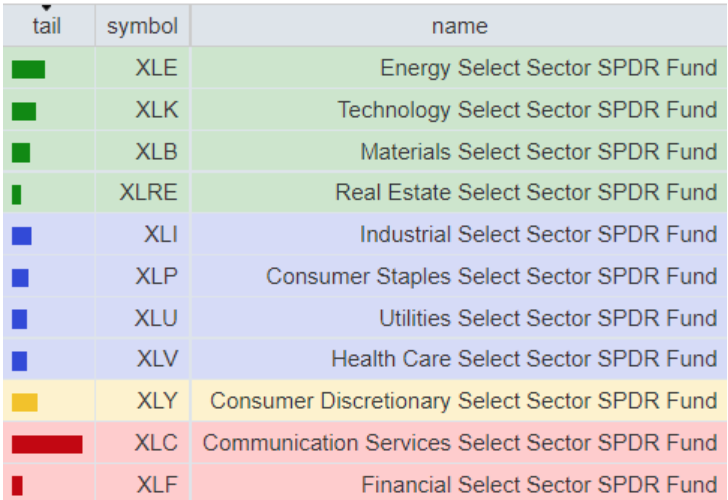 Energetici e finanziari continuano a guidare, insieme ad altre industrie cicliche. Tuttavia anche qui un reversal non è da escludere in base al comportamento del T-10yrs e delle commodity.