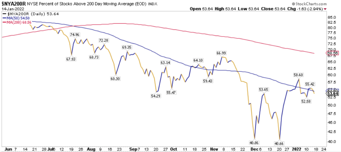 La percentuale dei titoli S&P500 scambiati sopra la loro media mobile a 200 periodi è pari al 67.74%, sul Nasdaq100 il 53.00% dei titoli prezza sopra lo stesso indicatore, mentre sul NYSE la percentuale è pari al 53.64%.