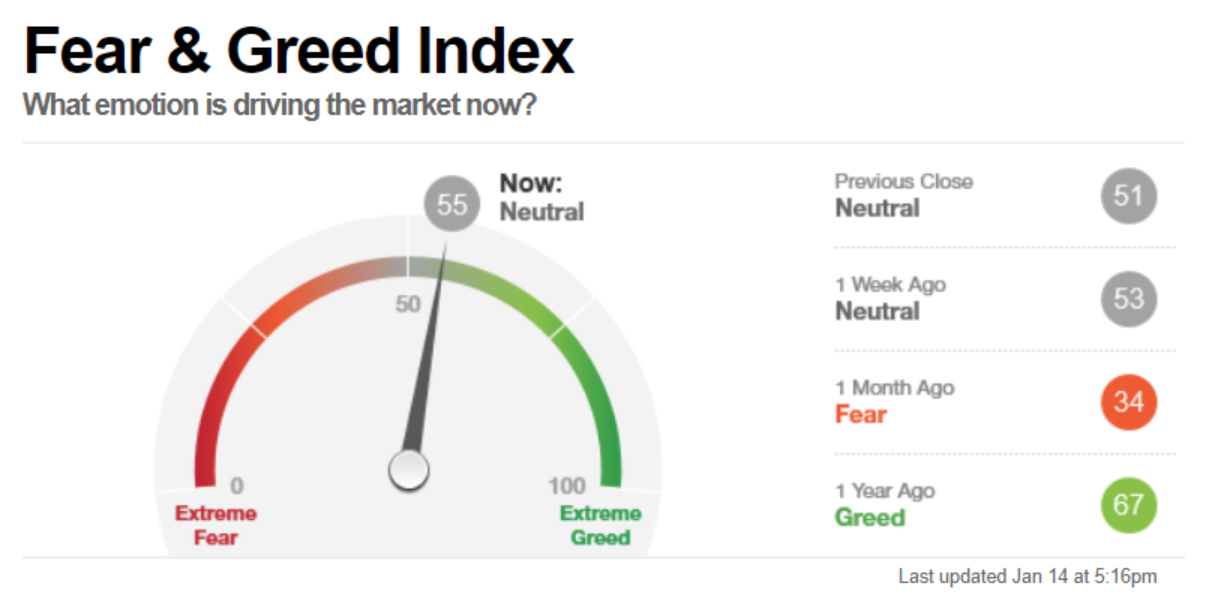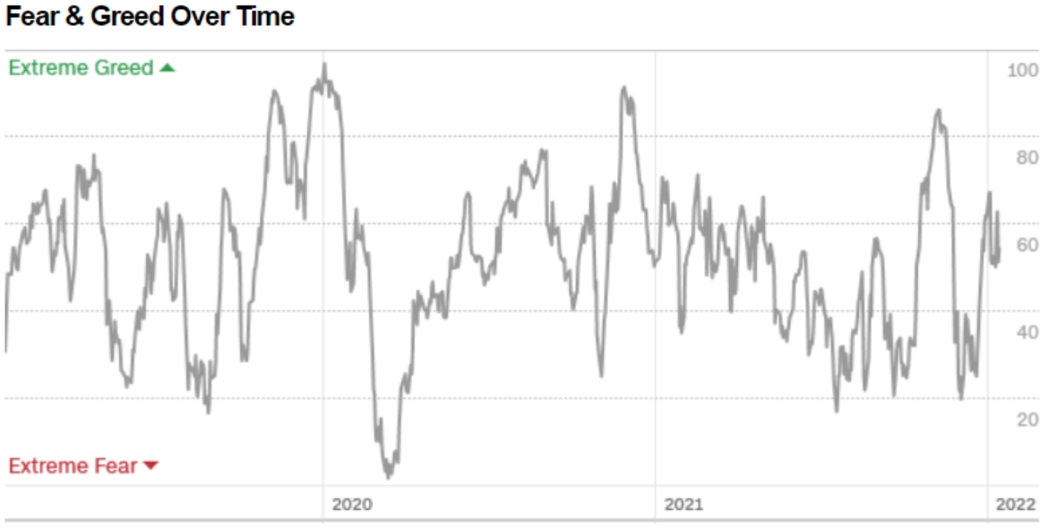 Il Fear&Greed Index sale a quota 55, indicando equilibrio tra paura ed avidità. Una settimana fa il valore era pari a 53.