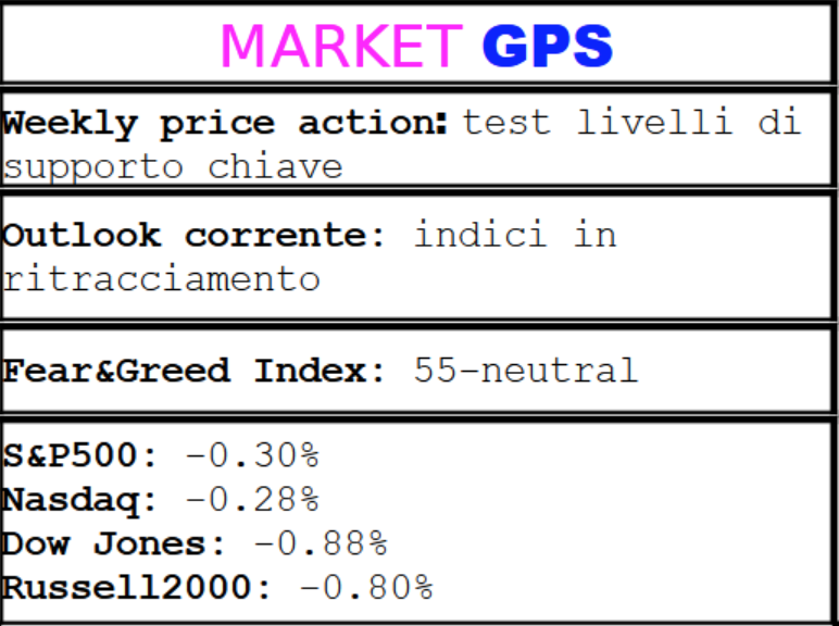 Rimbalzo in stand-by dopo il test di un’area di resistenza Mercoledì, seguito da nuove vendite nelle giornate di Giovedì e Venerdì mattina. Positivo tuttavia il recupero del Nasdaq nell’area della SMA200D.