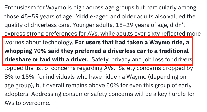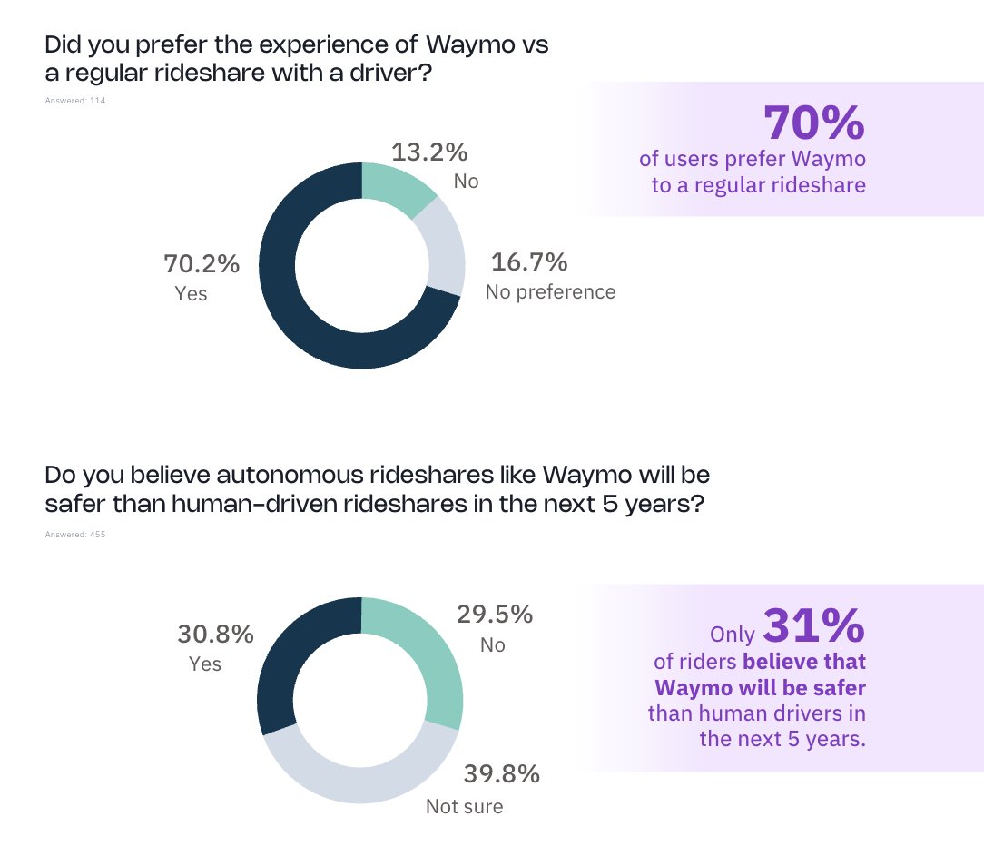 I residenti dell’Arizona sono più preoccupati dei fallimenti tecnologici (74% contro il 64% dei californiani), mentre i californiani che hanno usato Waymo sono più sensibili ai costi (38% contro il 31% di chi non l’ha usato) e alla privacy (51% contro il 12% in Arizona).