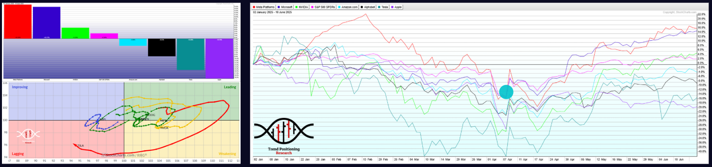 Prendiamo il 2025 come esempio. Tra i Magnificent 7, Apple ($AAPL) è il peggiore performer da inizio anno (YTD), con un calo del 21%. Solo Meta ($META), Microsoft ($MSFT) e NVIDIA ($NVDA) stanno superando l’S&P 500 ($SPX), che registra un +7,06% YTD. Nel frattempo, l’ETF MAGS è in calo del 1,97%, mentre Berkshire Hathaway, pur con un +7% YTD, ha perso il 7,48% negli ultimi tre mesi. In questo contesto, il nostro portafoglio tecnologico THÉMA – TPR (Trend Positioning Research) brilla con una crescita del 21,02%, sovraperformando il mercato.