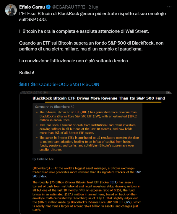 Nel 2024, l’approvazione dell’ETF sul Bitcoin di BlackRock, $IBIT, ha segnato un momento storico, superando in entrate il suo omologo sull’S&P 500. Come ha scritto Efisio Garau il 2 luglio 2025, questo non è solo un traguardo, ma un cambio di paradigma. Bitcoin non è più un esperimento di nicchia: ha conquistato il centro della scena a Wall Street, con una fiducia istituzionale ormai innegabile. Questo successo sta accendendo i riflettori su una trasformazione più ampia, guidata dalla blockchain e dalla tokenizzazione.
