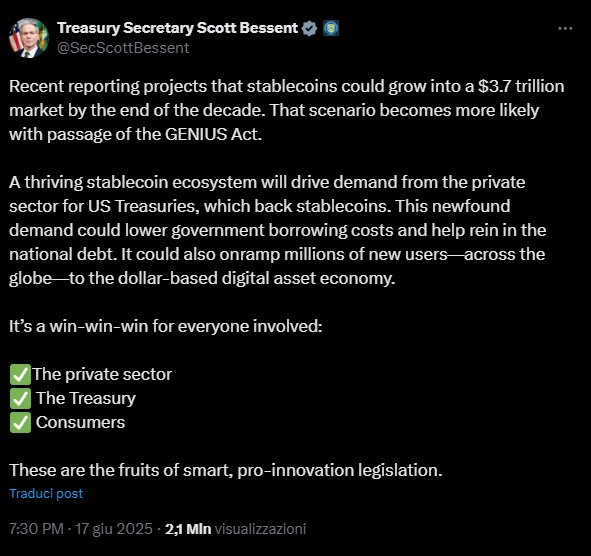 Guardando al futuro, le stablecoin si pongono come avanguardia della convergenza tra servizi finanziari e criptovalute. La prossima generazione sarà attratta da aziende crypto-friendly come Robinhood ($HOOD), Circle ($CRCL), Coinbase ($COIN), JPMorgan ($JPM) e Goldman Sachs ($GS). Di conseguenza, le banche integreranno asset come Bitcoin ($BTC) ed Ethereum ($ETH) tramite staking nei loro bilanci, segnando un’evoluzione naturale del sistema finanziario.