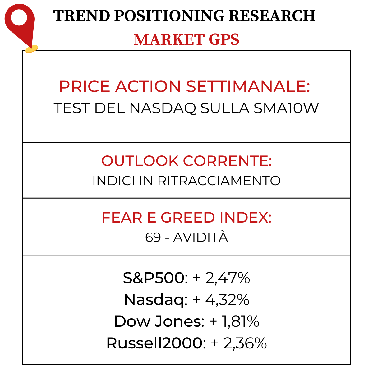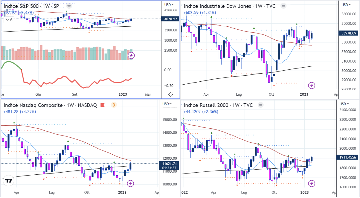 Nasdaq sopra la propria SMA200D, mentre l’S&P500 ha allungato dallo stesso indicatore e si è avvicinato ai massimi di Dicembre. Russell2000 alla prese coi massimi di fine 2022.
