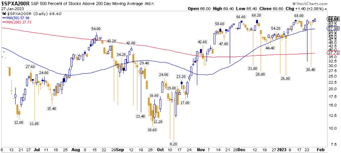 La percentuale dei titoli S&P500 scambiati sopra la loro media mobile a 200 periodi è pari al 68.60%, sul Nasdaq100 il 63.00% dei titoli prezza sopra lo stesso indicatore, mentre sul NYSE la percentuale è pari al 66.58%.