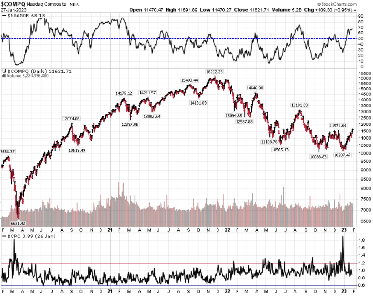 Divergenza $NAAR50 vs $COMP: aumento della percentuale di titoli che prezzano sopra la SMA50 rispetto alla settimana precedente, in convergenza con il rialzo dell’indice.