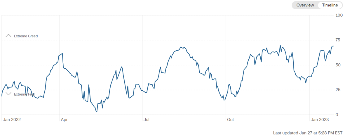 Il Fear&Greed Index sale a quota 69, indicando l’avidità come sentiment prevalente. Una settimana fa il valore era pari a 59.