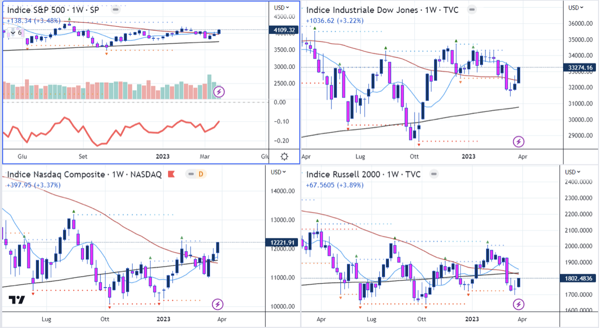 Megacap ancora protagoniste nel rialzo di Nasdaq e S&P500, ma la combinazione fra crisi bancaria in stand-by e aspettative su un picco dei FED Funds sotto le aspettative più recenti hanno supportato anche alcune growth stock.