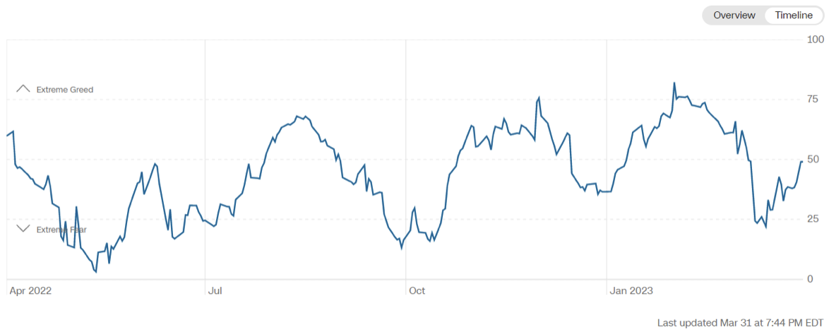 Il Fear&Greed Index sale a quota 49, indicando neutralità tra l’avidità e la paura come sentiment prevalente. Una settimana fa il valore era pari a 37.
