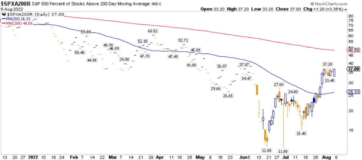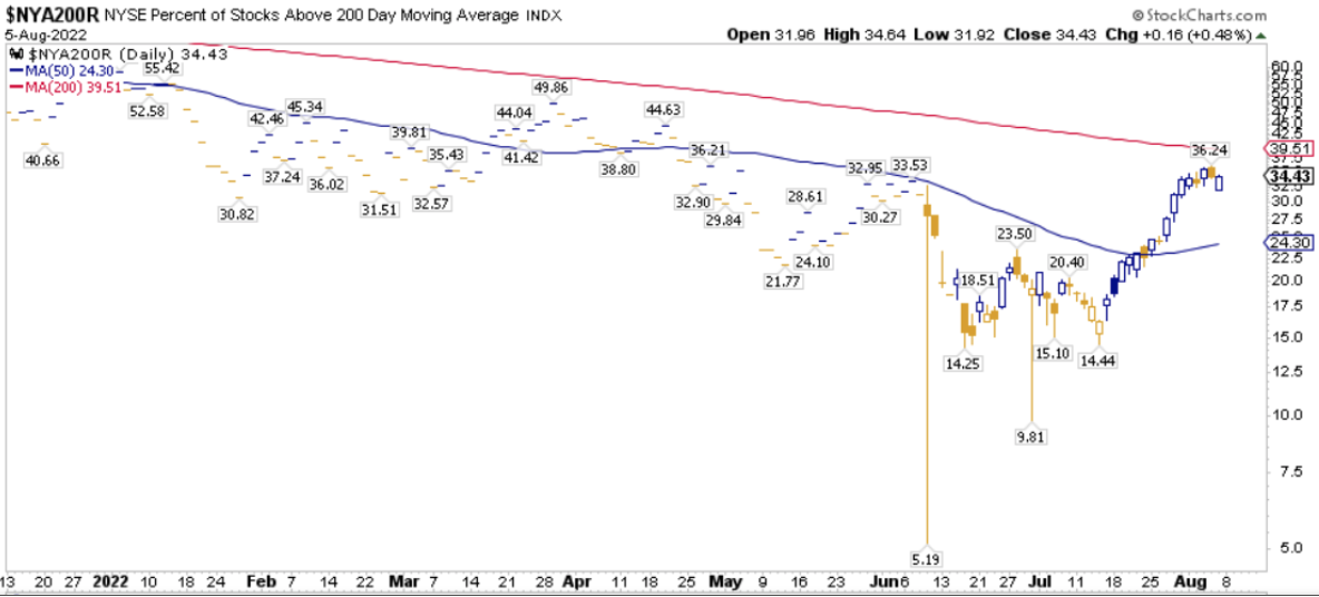 La percentuale dei titoli S&P500 scambiati sopra la loro media mobile a 200 periodi è pari al 37.00%, sul Nasdaq100 il 33.00% dei titoli prezza sopra lo stesso indicatore, mentre sul NYSE la percentuale è pari al 34.43%.