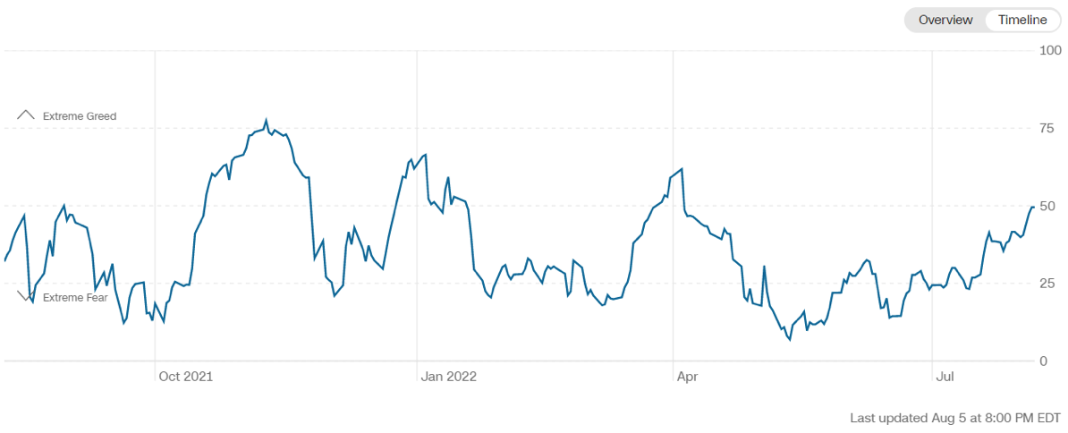 Il Fear&Greed Index sale a quota 50, indicando equilibrio tra paura ed avidità. Una settimana fa il valore era pari a 41.