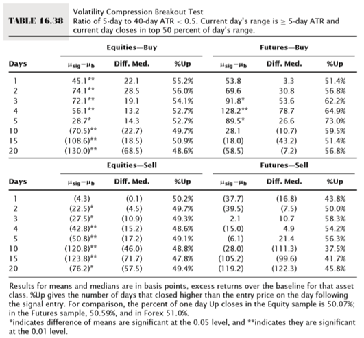 Esistono molti modi per definire la compressione della volatilità, ma questa tabella mostra un test su un sistema di compressione della volatilità molto semplice. Si noti la forte tendenza direzionale a breve termine per le azioni.